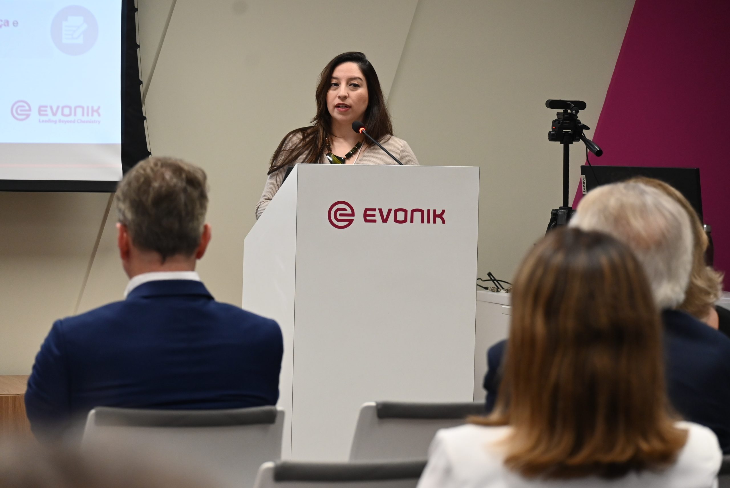 Dando continuidade para a apresentação da empresa, Aline Caldas, Gerente de Sustentabilidade da Evonik para América Central e do Sul, compartilhou as propostas de sustentabilidade na Evonik, detalhando os principais projetos da companhia. “A sustentabilidade é a espinha dorsal para a Evonik”, afirmou, trazendo como o conceito é central para a tomada de decisões e estratégias da companhia.