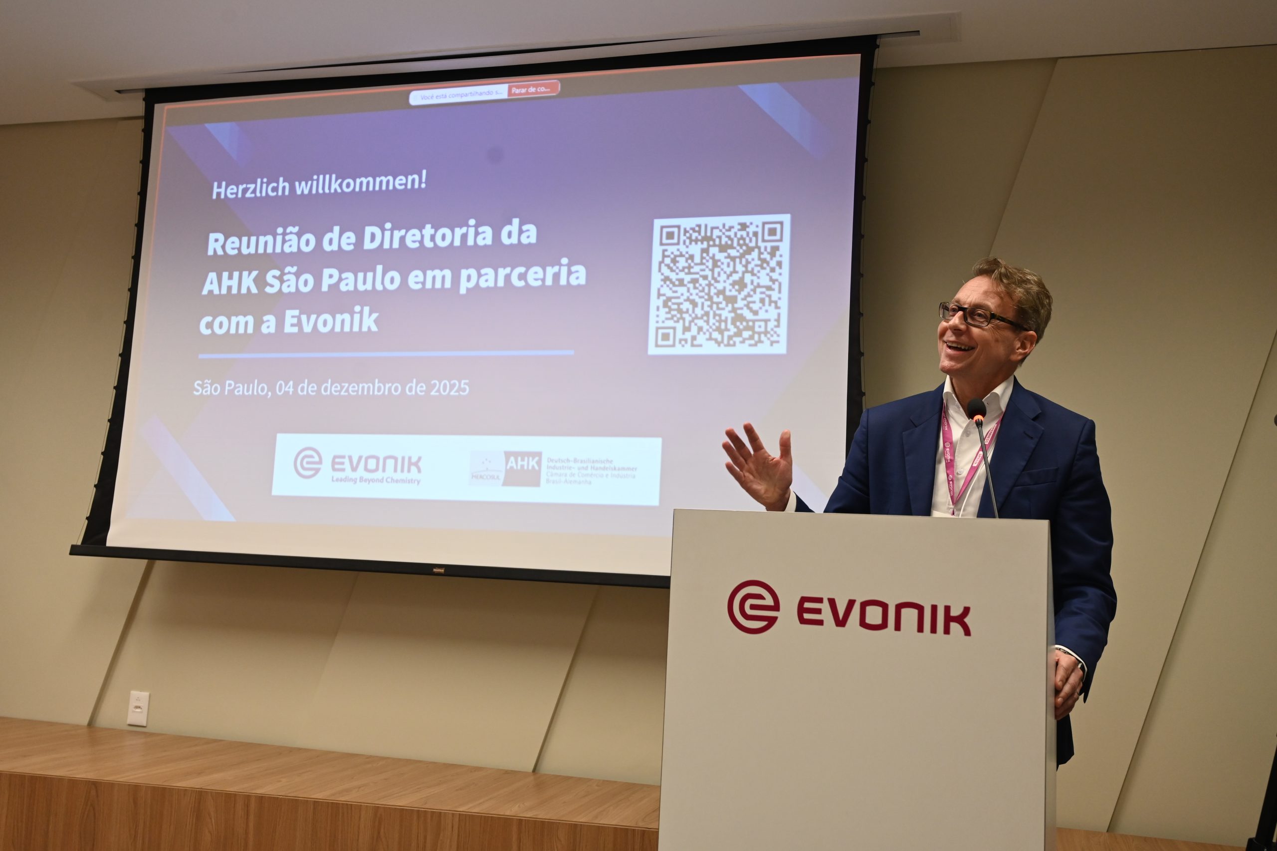 Iniciando a apresentação temática sobre o setor químico, Dr. Schönfelder apresentou a história na Evonik, destacando áreas de atuação da empresa e o vasto portifólio da companhia em produtos e soluções. O CEO também destacou os impactos da Evonik na América Central e do Sul, com as fábricas no Paraná, Espirito Santo, São Paulo e Santa Fé, na Argentina.